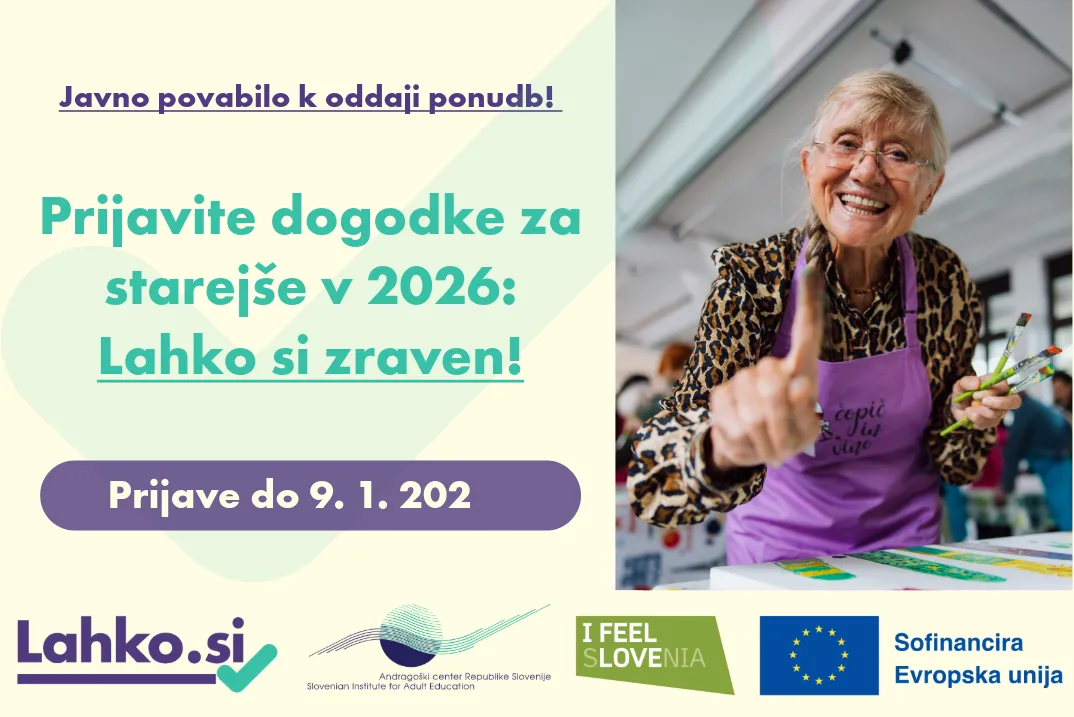 Na Andragoškem centru Slovenije v okviru projekta Ozaveščanje za vseživljenjsko učenje in kampanje Lahko.si vabimo organizatorje iz vse Slovenije k prijavi na javno povabilo za izvedbo dogodkov za starejše (65+) v letu 2026.